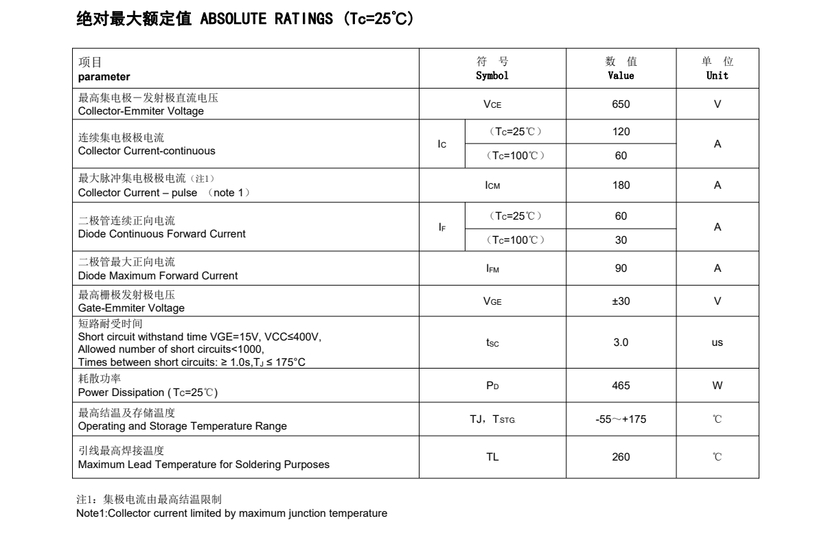 目前FHA60T65A詳細(xì)參數(shù):其具有60A, 650V, VCEsat典型值:1.75V,<2.0V;IC (Tc=100℃):60A;Bvces:650V;IF (Tc=25℃):60A;IF (Tc=100℃):30A。
